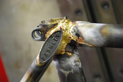 das leitfossil der vintage-fahrzeugflotte ist das "pashley guv'nor", ein 28"-spiesser-velo aus den 1930-er-jahren, lieblos nachgebaut mit primitiver löttechnik und billigkomponenten, aber - mundus vult decipi - zu einem sehr stolzen preis im handel. detail: die muffe ist aus billigem blech, schludrig mit messing zusammengelötet. das muss man - materialbedingt - mit 900°C machen, was die rohre ausglüht und ab werk kaputtmacht. minderwertiges löthandwerk erkennst du - unter anderem - daran, dass das lot nicht unter der ganzen muffe abgebunden hat, die spitzen der blechmuffe sind trocken und hängen in der luft! anständige rahmen werden mit silberlot um 600°C gebaut. die gabel dieses velos hat eine blechbrücke, die neigen immer mal wieder dazu, einfach das gabelschaftrohr zu verlieren. um von diesem billig-mist abzulenken machen sie einen reynolds-kleber auf den rahmen und schrauben einen brooks-sattel obendrauf. das exemplar, das sie auf der letzten eurobike dabeihatten, hatte eine beule im oberrohr, offenbar können die sich alles leisten!